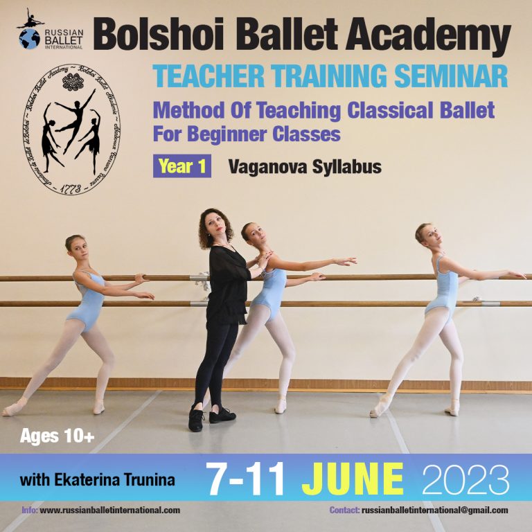 From June 7th through 11th, was hosted an Online Teacher Training Seminar For Beginner Classes, which aim was to reach a systematic, consequent, and methodically complete preparation for the career of ballet teacher by following the professional training Programs of the Bolshoi Ballet Academy. This course was taught by Ekaterina Trunina, the teacher of the Academy.